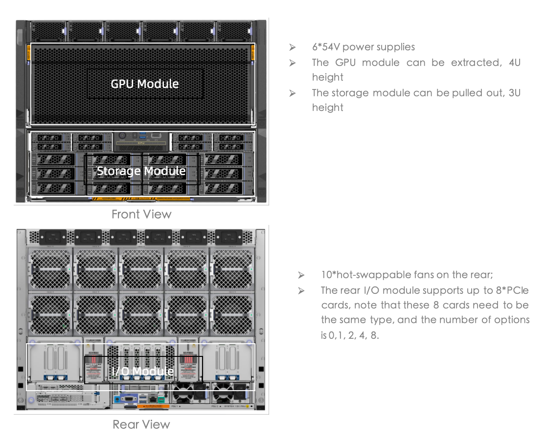 Power SupplyOptional 3300W 54V rear in and out power supply module, support 3+3 redundancySupports 2700W CRPS Platinum PSU (hot-swappable, 1+1 redundant)Voltage: 100~240V AC (refer to nameplate)